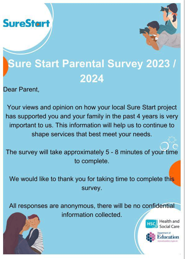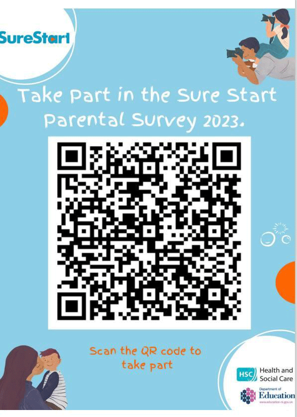 To take part in the Sure Start Parental Survey 2023 scan the QR Code to take part.